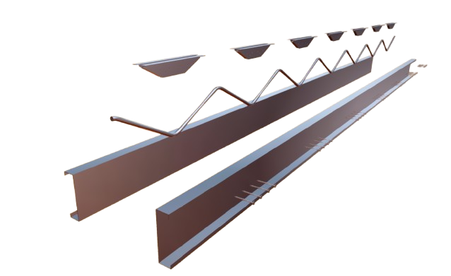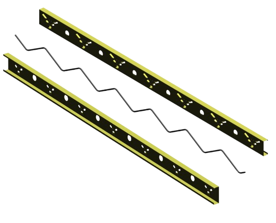 GFRP zig-zag bars are positioned between two cold-formed steel (CFS) channel sections featuring V-shaped punched patterns that mechanically interlock with the GFRP bars, creating an integrated assembly that structurally ties the metal studs while maintaining complete thermal isolation between the concrete wythe and steel framing. This connector-free design transfers loads through geometric engagement, eliminating thermal bridging without additional hardware.
